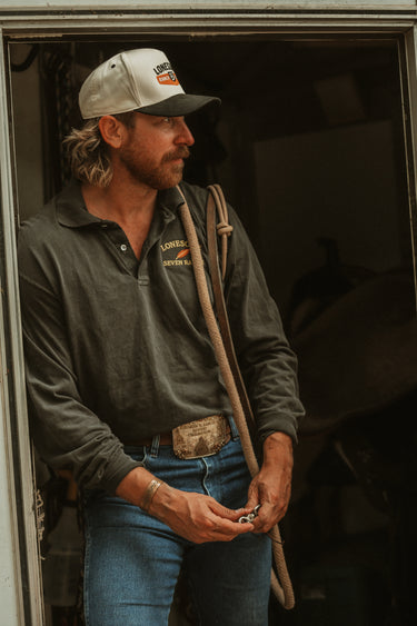Growing up on ranches, polos like this became a staple for long days that ran from early morning saddling to late nights in town. It carries forward that balance of toughness and refinement, built on the same values that built L7R: cattle, horses, family, and faith.