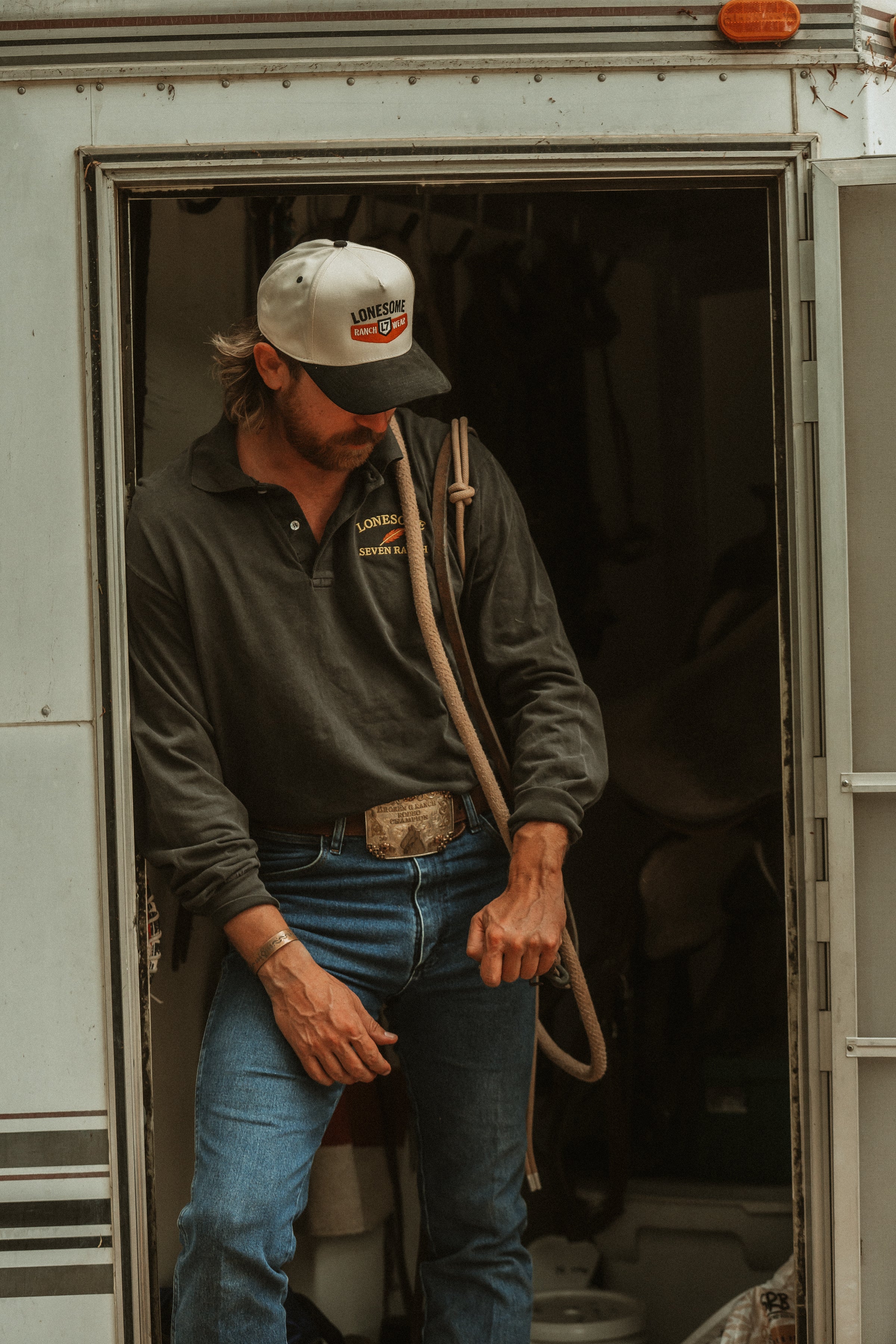 - Embroidered “Lonesome Seven Ranch” chest logo + feather icon