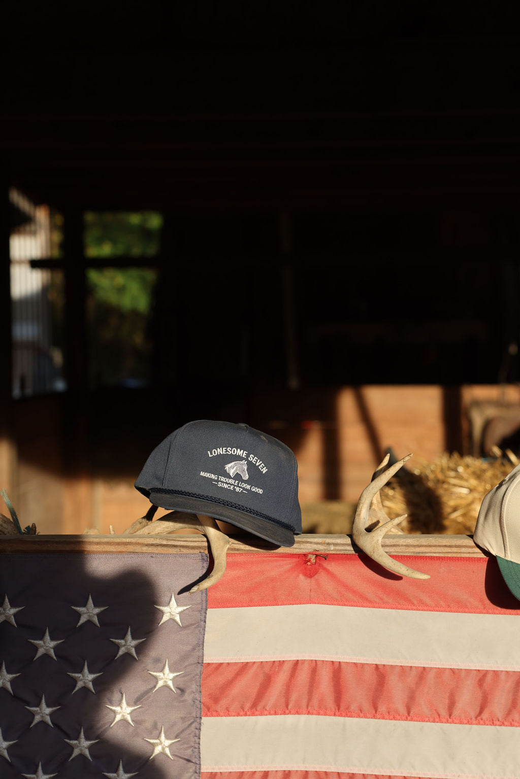 Making trouble look good since ’87. The Trouble Maker Rope Snapback is a navy rope hat with a bold horse graphic, built for cowboys and outlaws alike.