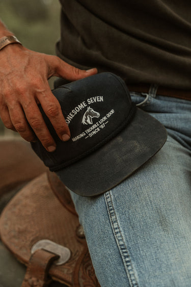Embroidered with a rearing horse and the words “Making Trouble Look Good Since ’87”, this hat embodies grit, rebellion, and freedom. The navy crown and rope accent nod to vintage Western style, while the structured build makes it tough enough for long days in the saddle or late nights raising hell.
